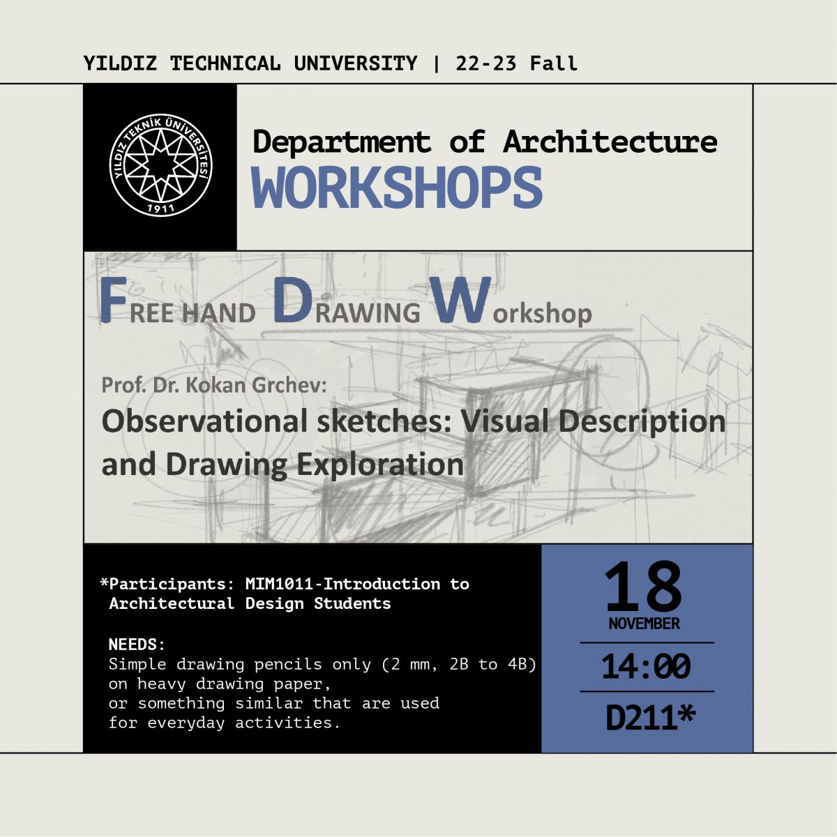 18 Kasım 2022 Cuma günü saat 14:00'de, D211 no'lu atölyede, Prof. Dr. Kokan Grchev'in 'Free Hand Drawing Workshop' başlıklı 'Observational sketches: Visual Description and Drawing Exploration' konulu atölye çalışması gerçekleşecektir.