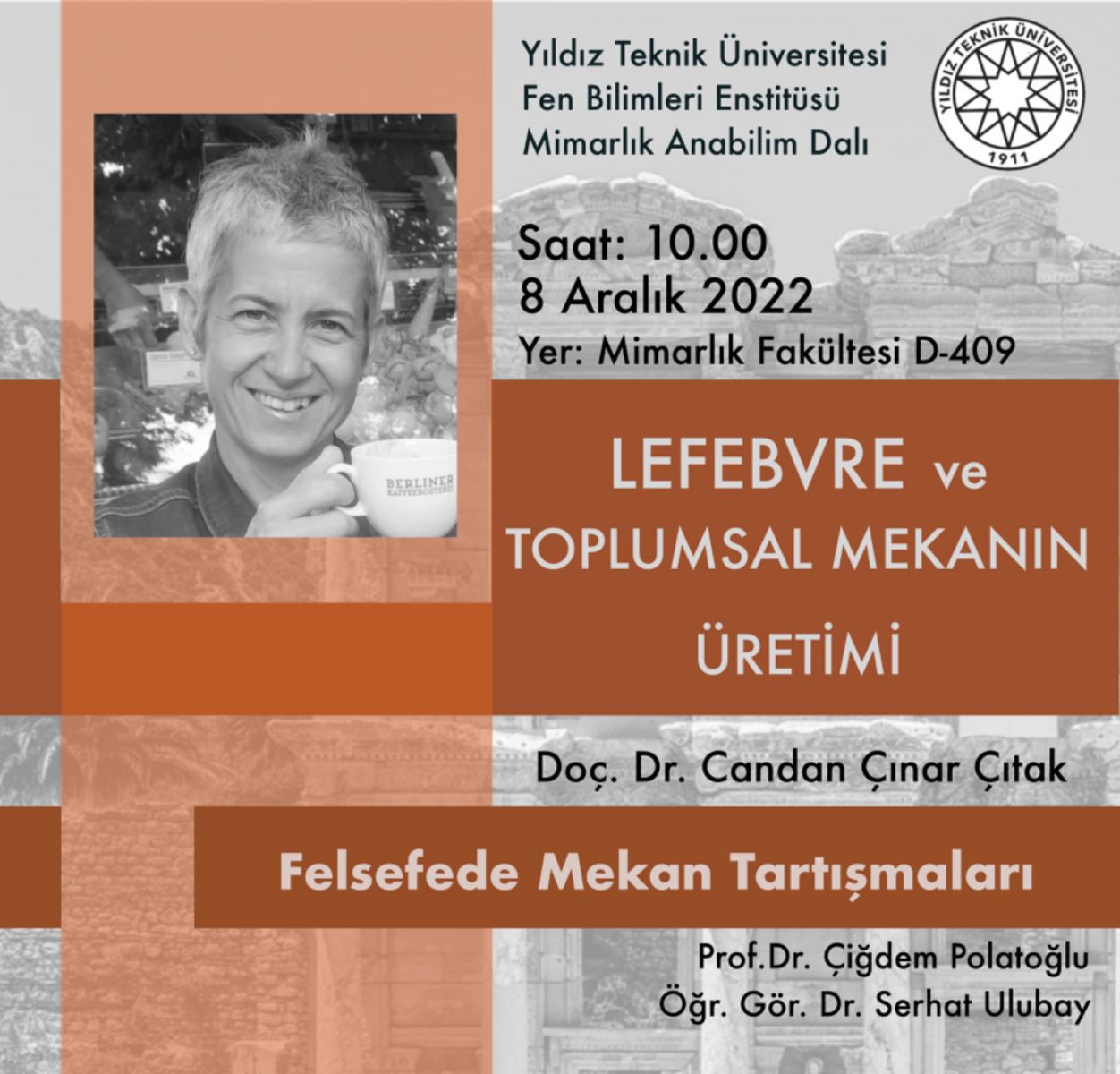 Prof. Dr. Çiğdem Polatoğlu ve Öğr. Gör. Dr. Serhat Ulubay'ın yürütücüğünü üstlendiği, Felsefede Mekan Tartışmaları doktora dersi kapsamında gerçekleştirilen söyleşinin konuğu fakültemiz öğretim üyelerinden Doç. Dr. Candan Çınar Çıtak olacaktır. 8 Aralık 2022 Perşembe günü saat 10:00'da fakültemiz D-409 no'lu atölyede gerçekleşecek olan söyleşiye katılım serbesttir.