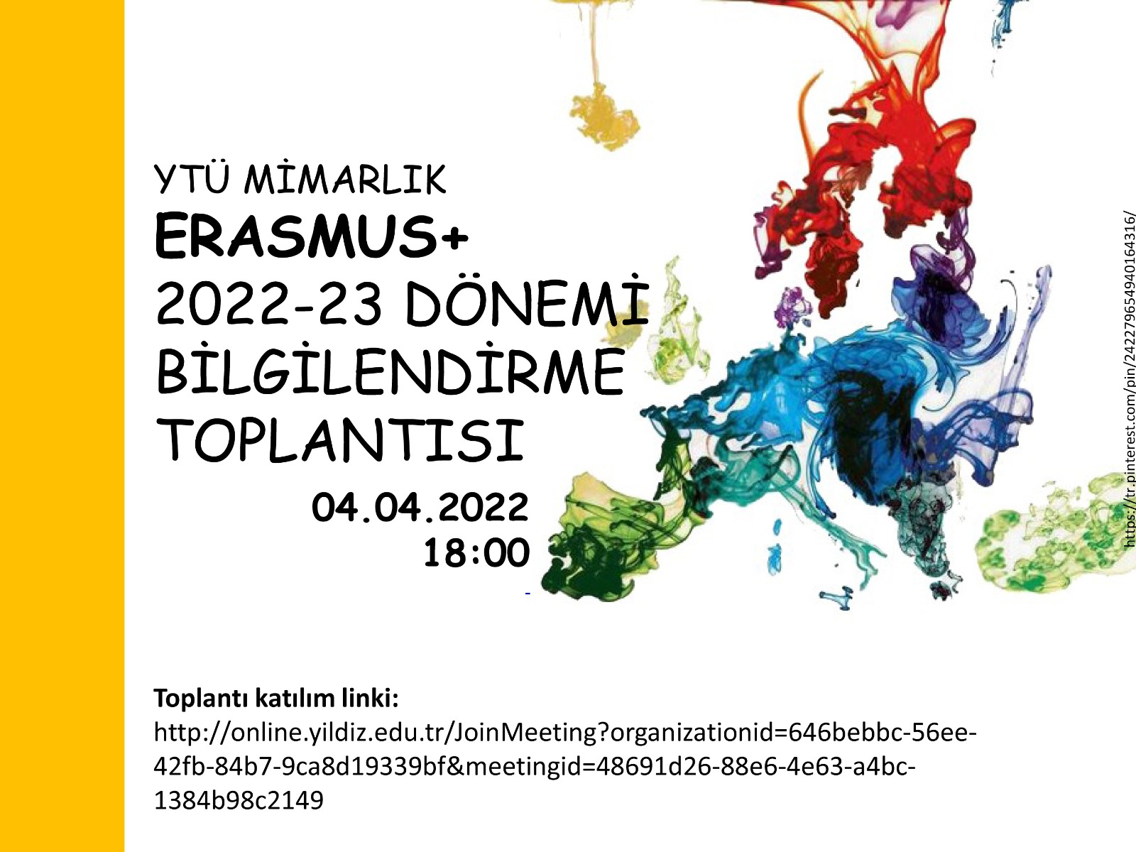 2022-2023 Eğitim Dönemi Erasmus + bilgilendirme toplantısı 4 Nisan 2022 Pazartesi günü saat 18:00'de gerçekleştirilecektir. Toplantıya aşağıdaki link aracılığı ile katılım sağlayabilirsiniz.