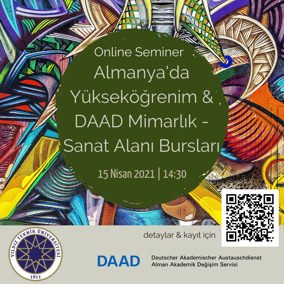 Uluslararası İlişkiler Koordinatörlüğü ve DAAD iş birliği ile 15 Nisan 2021 Perşembe Saat 14.30'da Almanya'da Yükseköğrenim ve DAAD Mimarlık ve Sanat Alanı Bursları online seminer gerçekleştirilecektir.