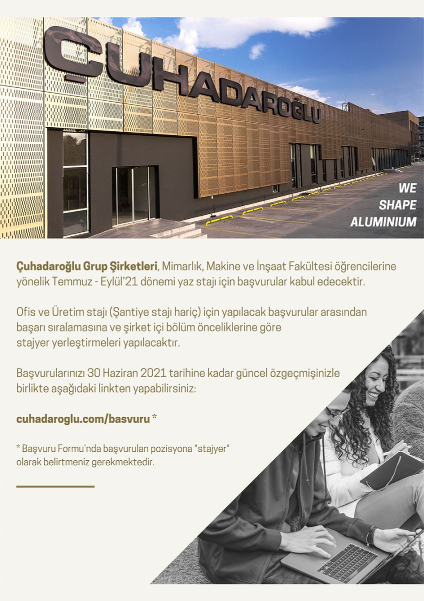 Çuhadaroğlu Grup Şirketleri, Mimarlık, Makine ve İnşaat Fakültesi öğrencilerine yönelik Temmuz-Eylül 2021 dönemi yaz stajı için başvurular kabul edecektir.