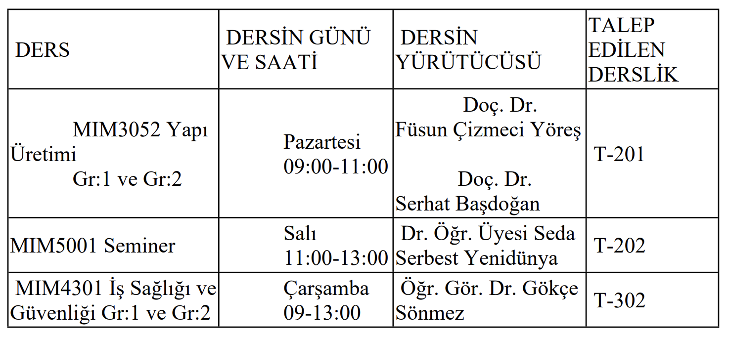 Oditoryum Sergi Salonu'ndaki faaliyetlerin durdurulması kararı gerekçesiyle Bölümümüz tarafından yürütülmekte olan aşağıdaki dersler için Gemi İnşaatı ve Denizcilik Fakültesi derslikleri 2025-26 Bahar yarıyılı akademik takvim sonuna kadar kullanımımıza rezerve edilmiştir.