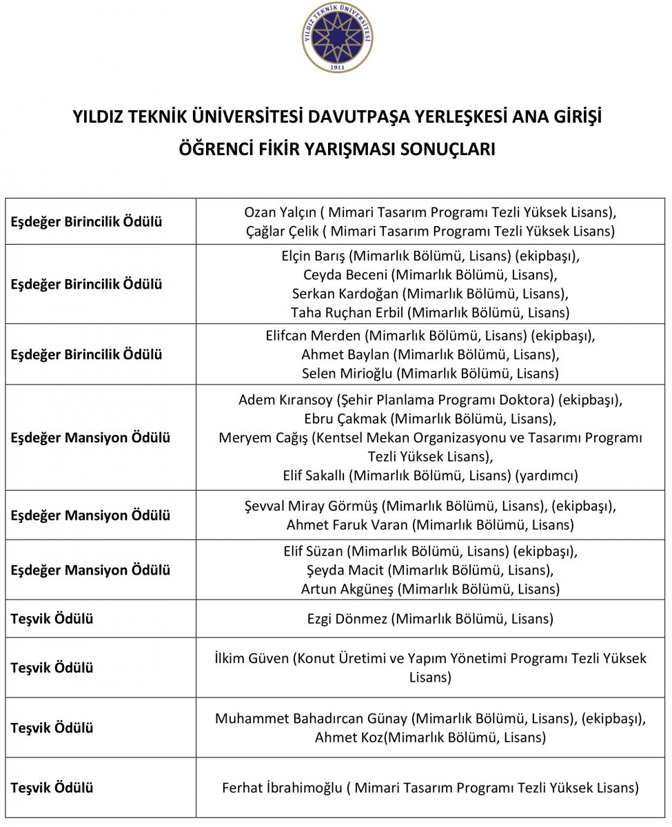 Yıldız Teknik Üniversitesi Rektörlüğü tarafından düzenlenen ve Yıldız Teknik Üniversitesi’nde eğitim gören önlisans, lisans ve lisansüstü öğrencilerine açık, iki aşamalı ‘Yıldız Teknik Üniversitesi Davutpaşa Yerleşkesi Ana Girişi Öğrenci Fikir Yarışması’nda ödül kazanan tüm öğrencileirmizi tebrik eder, başarılarının devamını dileriz.