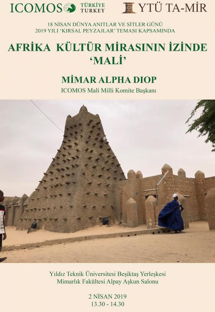 ICOMOS Başkan Yardımcısı ve ICOMOS-Mali Milli Komite Başkanı Mimar Alpha Diop, 2 Nisan 2019 Salı günü 13:30-14:30 saatleri arasında, fakültemiz Alpay Aşkun Salonu’nda "Afrika Kültür Mirasının İzinde Mali" başlıklı bir konferans verecektir. Etkinliğe tüm öğretim üyelerimiz ve öğrencilerimiz davetlidir.