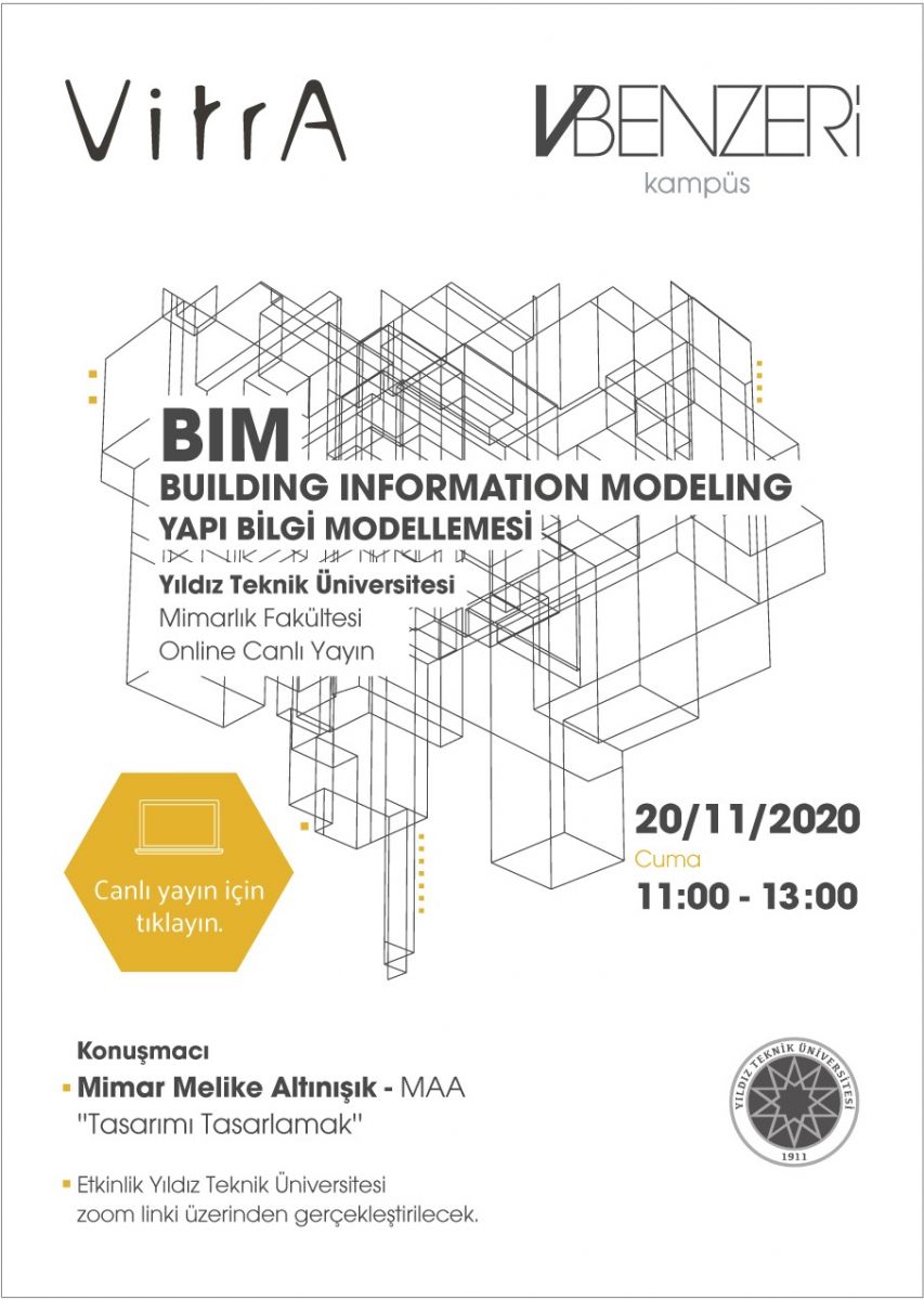 Mimar Melike Altınışık'ın BIM Building Information Modeling başlıklı çevrimiçi söyleşisi, 20 Kasım 2020 Cuma günü 11:00-13:00 saatleri arasında gerçekleşecektir. Sunum dili İngilizce olacak olan etkinliğe, aşağıdaki link ve toplantı kodu aracılığıyla katılım sağlanabilir