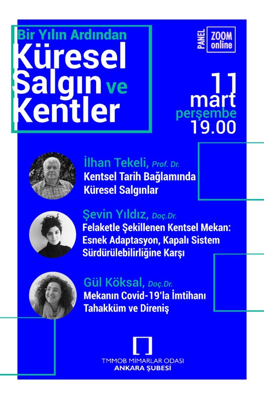 Mimarlar Odası Ankara Şubesi pandemi ilanının yıldönümünde, küresel ölçekte yaşanan bu salgının tarihsel, toplumsal ve mesleki açıdan etkilerinin kentlerde nasıl sonuçlar doğurduğunu tartışmaya açmak üzere 11 Mart 2021 Perşembe günü saat:19.00’da "Bir Yılın Ardından Küresel Salgın ve Kentler" başlığıyla panel düzenliyor.