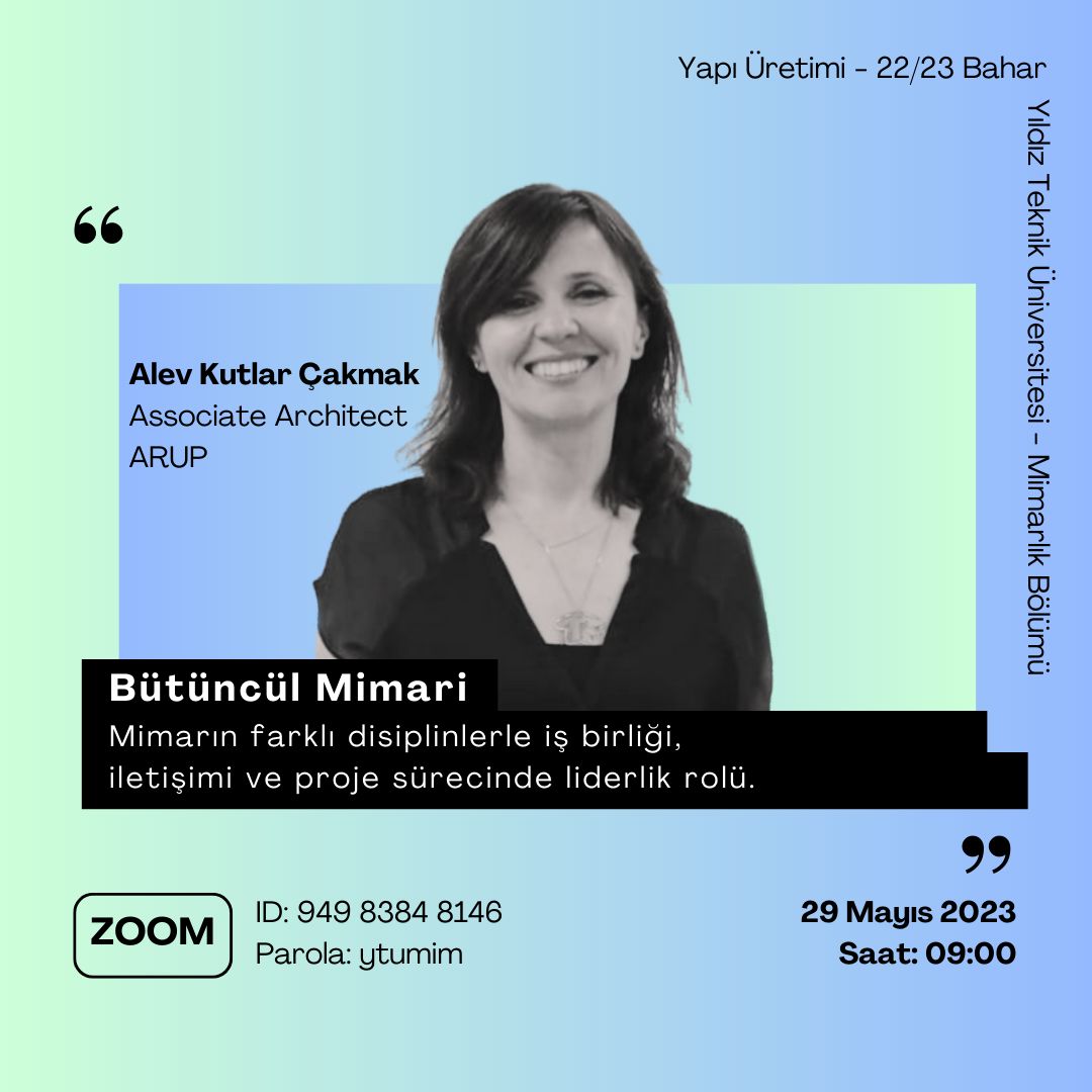 Alev Kutlar Çakmak tarafından "Bütüncül Mimari Mimarın Farklı Disiplinlerle İş birliği, İletişimi ve Proje Sürecinde Liderlik Rolü" başlıklı seminer, 29 Mayıs Pazartesi günü saat 09:00'da çevrimiçi olarak gerçekleştirilecektir.