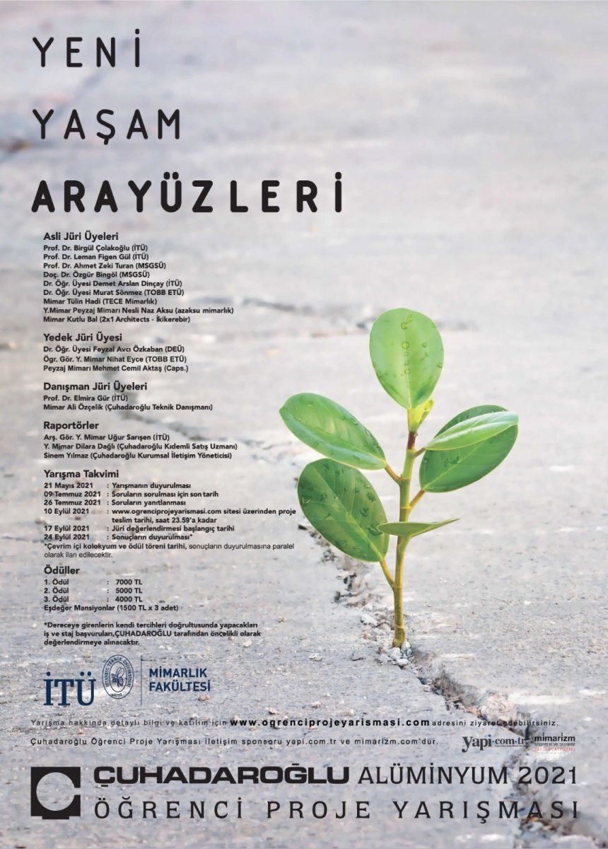 Konusu “Yeni Yaşam Arayüzleri” olarak belirlenen Çuhadaroğlu Öğrenci Proje Yarışması’nın 18.si İTÜ Mimarlık Fakültesi ev sahipliğinde düzenleniyor. Katılımcılardan, kır/kent ile birey/toplum bağlamında gündelik koşulları gözeten bir tasarım problemi tanımlamaları ve buna yönelik çözüm senaryoları oluşturmaları bekleniyor. Projelerin son teslim tarihi 10 Eylül 2021.