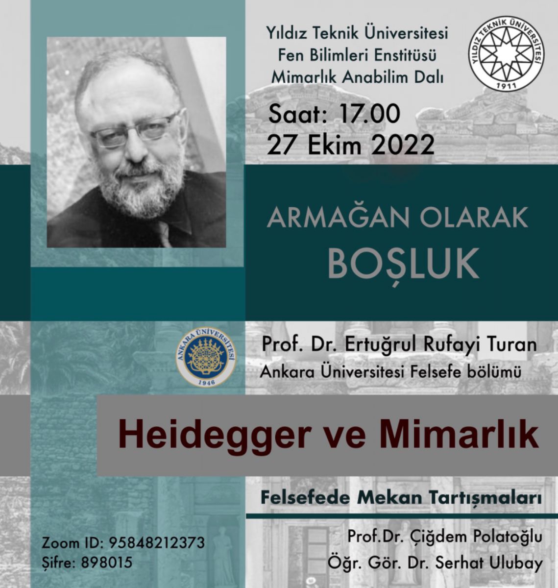 Prof. Dr. Çiğdem Polatoğlu ve Öğr. Gör. Dr. Serhat Ulubay'ın yürütücügünü üstlendiği, Felsefede Mekan Tartışmaları doktora dersi kapsamında gerçekleştirilen çevrimiçi etkinliğe Ankara Üniversitesi Felsefe Bölümü öğretim üyelerinden Prof. Dr. Ertuğrul Rufayi Turan konuk olacaktır. 27 Ekim 2022 Perşembe günü saat 17:00'de gerçekleşecek olan çevrimiçi etkinlik katılıma açıktır.