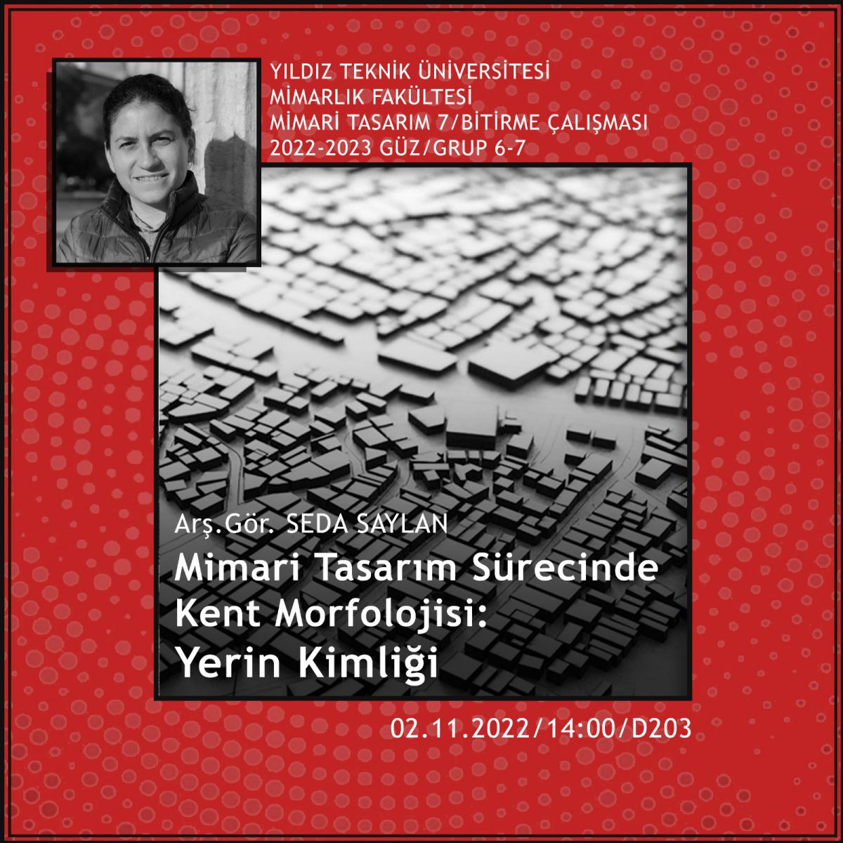 2022-2023 Güz Dönemi Mimari Tasarım 7 ve Bitirme Çalışması (Grup 6-7) kapsamında, 2 Kasım 2022 Çarşamba günü saat 14:00'da, D-203 no'lu atölyede, Araş. Gör. Seda Saylan'ın 'Mimari Tasarım Sürecinde Kent Morfolojisi: Yerin Kimliği' başlıklı semineri gerçekleşecektir.