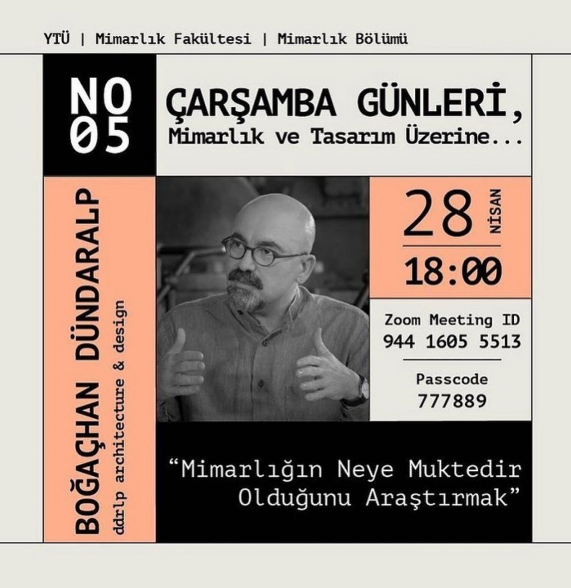 Bölümümüz tarafından düzenlenen Çarşamba Günleri, Mimarlık ve Tasarım Üzerine... ​ çevrimiçi etkinliklerinin beşinci konuğu"Mimarlığın Neye Muktedir Olduğunu Araştırmak" adlı söyleşisiyle Boğaçhan Dündaralp olacaktır. 28 Nisan 2021 Çarşamba saat 18:00'de başlayacak çevrimiçi etkinliğe tüm öğretim üyelerimiz ve öğrencilerimiz davetlidir.