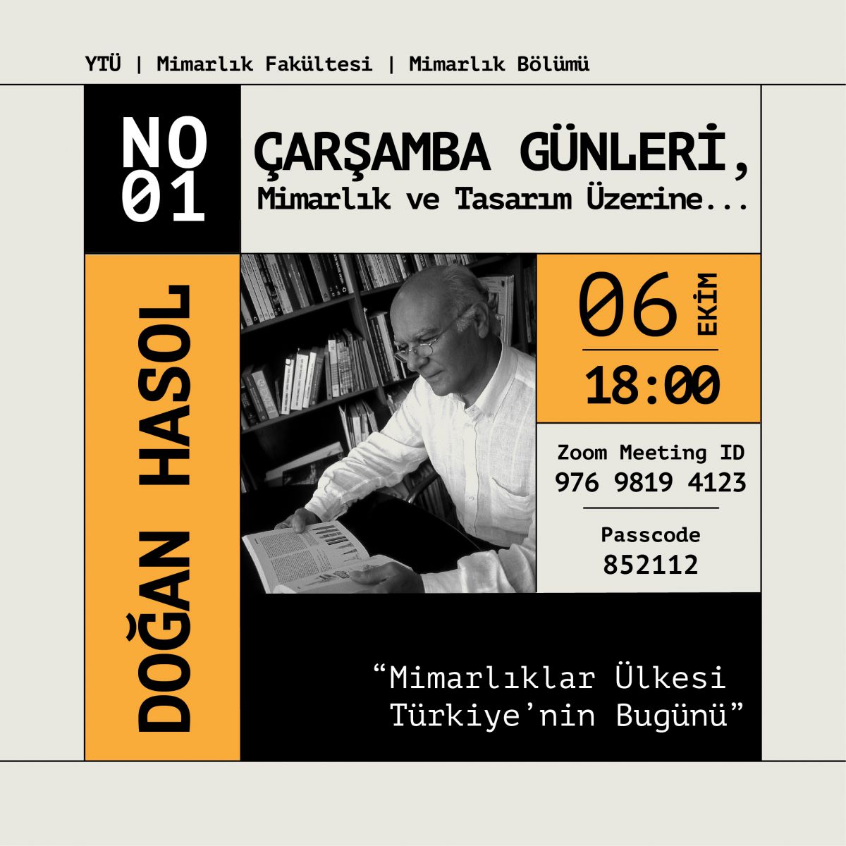 Bölümümüzün düzenlediği 2021-2022 Güz Dönemi Çevrimiçi Seminerleri kapsamında 6 Ekim Çarşamba akşamı saat 18:00’da yapılacak olan “Mimarlıklar Ülkesi Türkiye’nin Bugünü" başlıklı seminerin konuk konuşmacısı Doğan Hasol olacaktır.