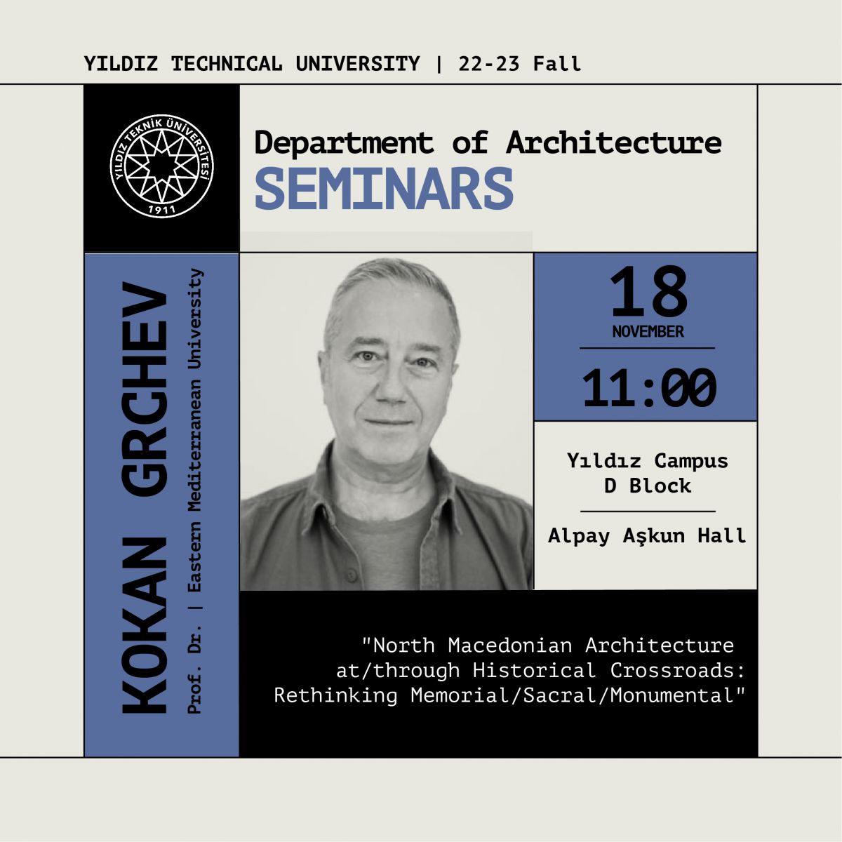 2022-2023 Güz Dönemi Mimarlık Bölümü Seminerleri kapsamında 18 Kasım 2022 Cuma günü saat 11:00'de, Alpay Aşkun Salonu'nda, Prof. Dr. Kokan Grchev'in 'North Macedonian Architecture at/through Historical Classroads: Rethinking Memorial / Sacral / Monumental' başlıklı semineri gerçekleşecektir.