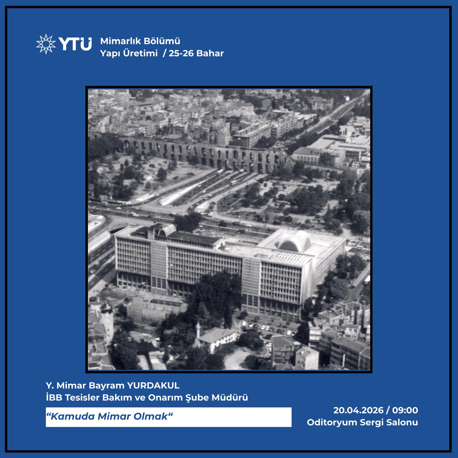 Yapı Üretimi dersi kapsamında “Kamuda Mimar Olmak” başlıklı seminer 20 Nisan pazartesi günü saat 09:00’da Oditoryum Sergi Salonunda gerçekleştirilecektir.