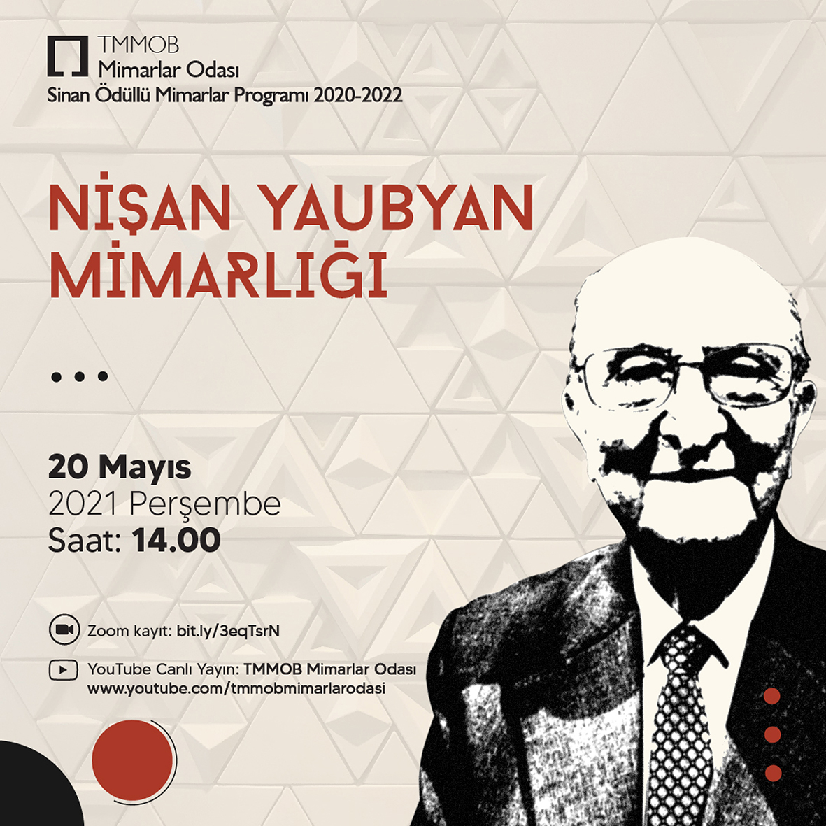 Mimar Sinan Büyük Ödülü sahibi NİŞAN YAUBYAN için düzenlenen “Nişan Yaubyan Mimarlığı” adlı panel, 20 Mayıs 2021 Perşembe günü saat 14.00’te çevrimiçi olarak gerçekleşecek.
