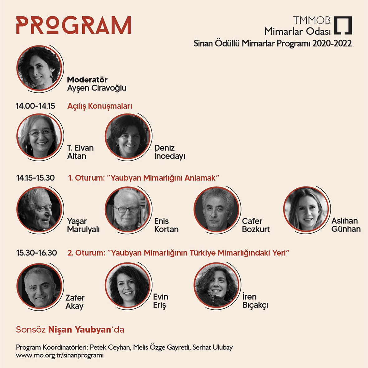 2020-2022 dönemi Sinan Ödüllü Mimarlar Programı kapsamında “Nişan Yaubyan Mimarlığı” başlığıyla düzenlenecek olan panel, 20 Mayıs 2021 Perşembe günü saat: 14.00’te gerçekleşecek. Ayşen Ciravoğlu’nun moderatörlüğünde ve T. Elvan Altan, Deniz İncedayı, Yaşar Marulyalı, Enis Kortan, Cafer Bozkurt, Aslıhan Günhan, Zafer Akay, Evin Eriş ve İren Bıçakçı’nın konuşmacı olarak katılacağı etkinlikte sonsöz Nişan Yaubyan’ın olacak.