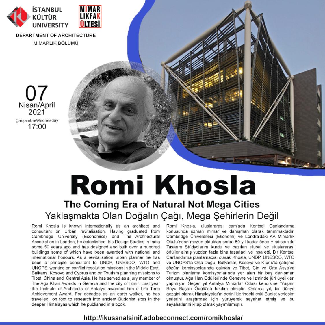 İstanbul Kültür Üniversitesi Mimarlık Bölümü tarafından organize edilen söyleşinin konuğu, Yaklaşmakta Olan Doğalın Çağı, Mega Şehirlerin Değil başlıklı söyleşisiyle Romi Khosla olacaktır. 7 Nisan 2021 Çarşamba saat 17:00'de başlayacak etkinliğe aşağıdaki linkten erişebilirsiniz.